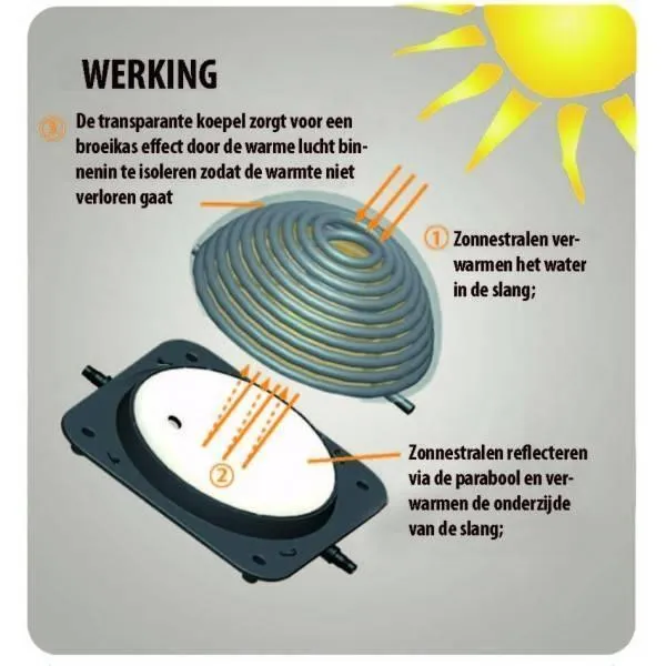 De Premium XL uitvoering van de AquaForte Solar Bol beschikt over een extra grote interne koepel van polycarbonaat met versterkt glasvezel materiaal en een interne reflectieparabool. De warmte van de zon wordt geïsoleerd door de koepel, zo creëer je een broeikaseffect wat het water in de interne slang verwarmt. Het UV-bestendige materiaal en de zwarte carbon polypropyleen slang zorgen in combinatie met de interne reflectie parabool voor een nog hoger rendement dan de standaard uitvoering. Een enkele heater kan een zwembad to 20m³ verwarmen.