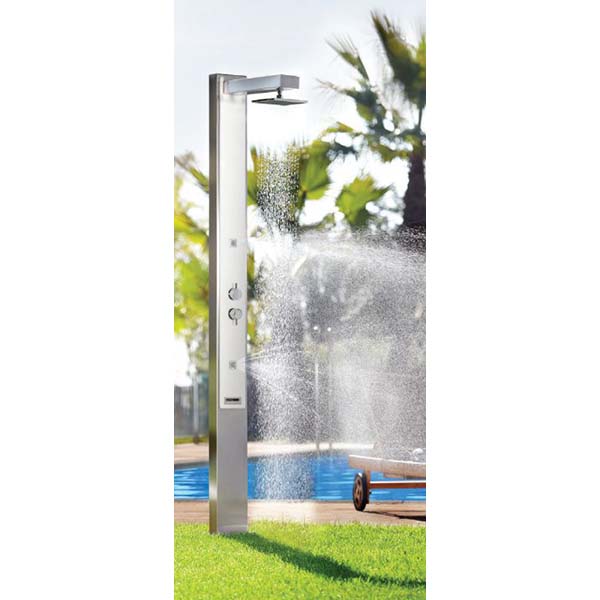 Astralpool Iguazu douche mat RVS-316 - warm/koud water met wit acryl voorpaneel. Deze buitendouche beschikt over een verstelbare anti-kalk douchekop welke messing verchroomd is. Daarnaast heeft de douche nog 2 zij-sproeiers die regelbaar zijn met een 2-wegkraan.