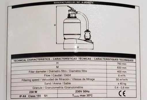 - Filtertype: zand 40 Kg / glas (niet bijgeleverd)