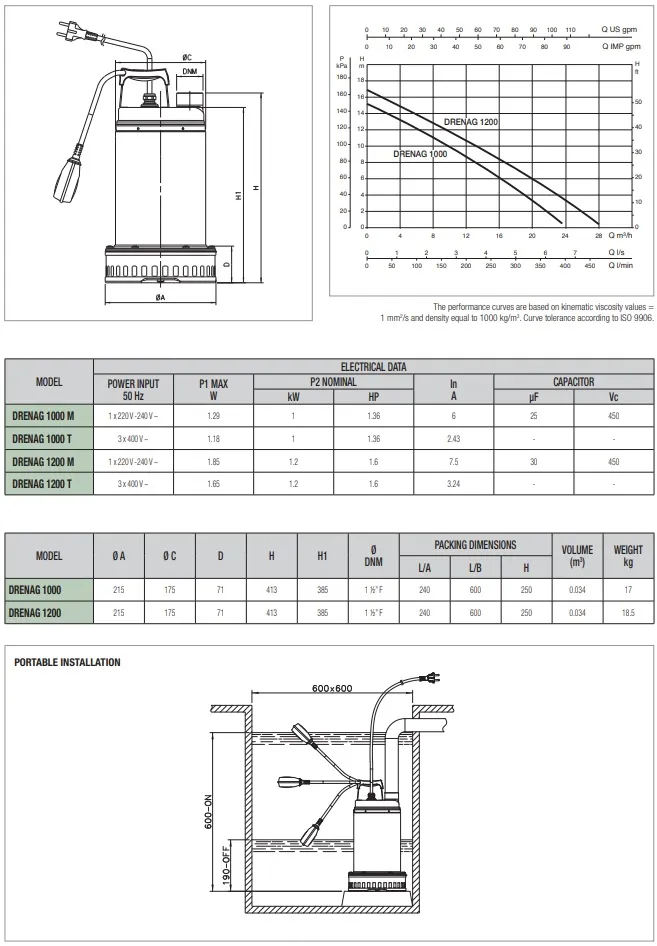 De DAB Drenag 1000 M-NA is geschikt voor continu gebruik en heeft een ingebouwde thermische beveiliging. De pomp heeft een maximale pompcapaciteit van 18.000 liter per uur en een maximale opvoerhoogte van 15 meter (1,5 bar). De DAB Drenag 1000 M-NA is een 230V pomp met een vermogen van 1 kW en wordt standaard geleverd met 10 meter stroomkabel.