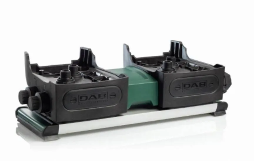 De DAB Esytwin is de grote broer van de Esydock. Op dit grotere dockingstation kun je twee Esyboxen aansluiten. Eenmaal aangesloten werken de pompen samen en communiceren ze via bluetooth met elkaar. Wanneer de druk te laag dreigt te worden zal één van de twee pompen bijspringen, zodat er een constante waterdruk is. Ook is deze duo-opstelling handig wanneer één van de twee pompen gedemonteerd wordt. In dit geval zal de overgebleven pomp doorpompen om de waterdruk op peil te houden.