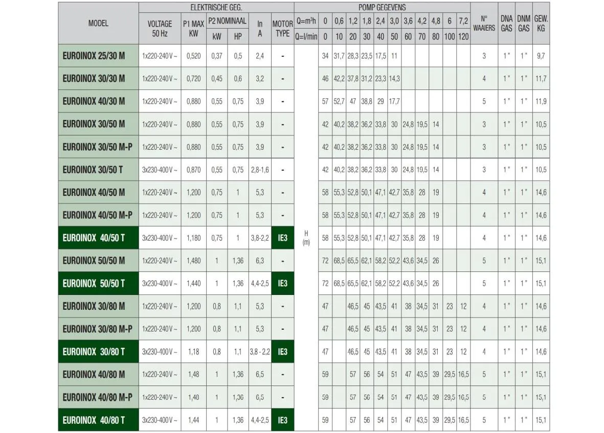 De DAB Euroinox 25/30 M is geschikt voor continu gebruik en kan tot 8 meter diep het water aanzuigen. De pomp heeft een maximale pompcapaciteit van 3.000 liter per uur en een maximale opvoerhoogte van 34 meter (3,4 bar). De DAB Euroinox 25/30 M is een 230V pomp met een vermogen van 0,37 kW en wordt standaard geleverd zonder aansluitkabel/stroomkabel.