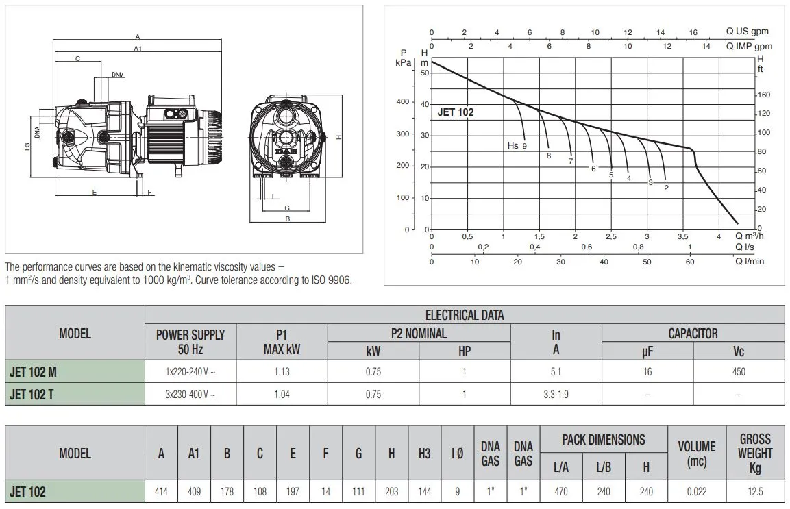 De DAB Jet 102 M is geschikt voor continu gebruik en kan tot 8 meter diep het water aanzuigen. De pomp heeft een maximale pompcapaciteit van 3.600 liter per uur en een maximale opvoerhoogte van 53 meter (5,3 bar). De DAB Jet 102 M is een 230V pomp met een vermogen van 0,75 kW en wordt standaard geleverd zonder aansluitkabel/stroomkabel.