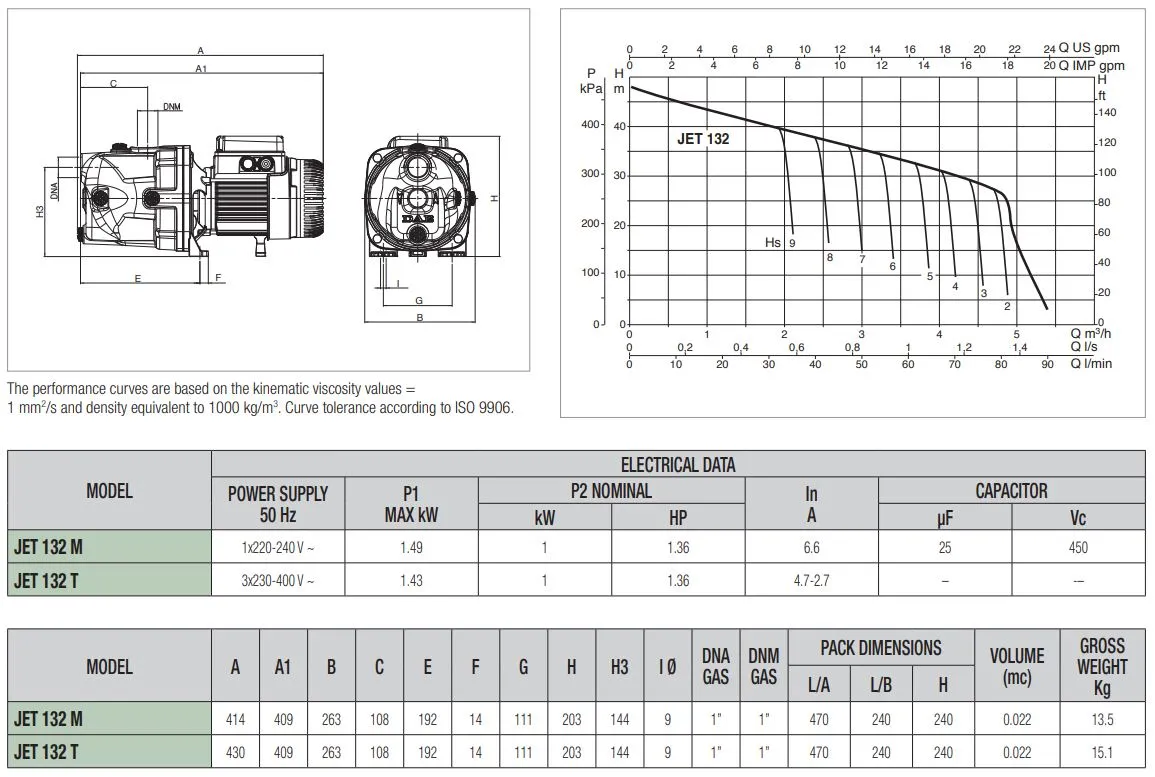 De DAB Jet 132 T is geschikt voor continu gebruik en kan tot 8 meter diep het water aanzuigen. De pomp heeft een maximale pompcapaciteit van 4.800 liter per uur en een maximale opvoerhoogte van 48 meter (4,8 bar). De DAB Jet 132 T is een 400V pomp met een vermogen van 1 kW en wordt standaard geleverd zonder aansluitkabel/stroomkabel.