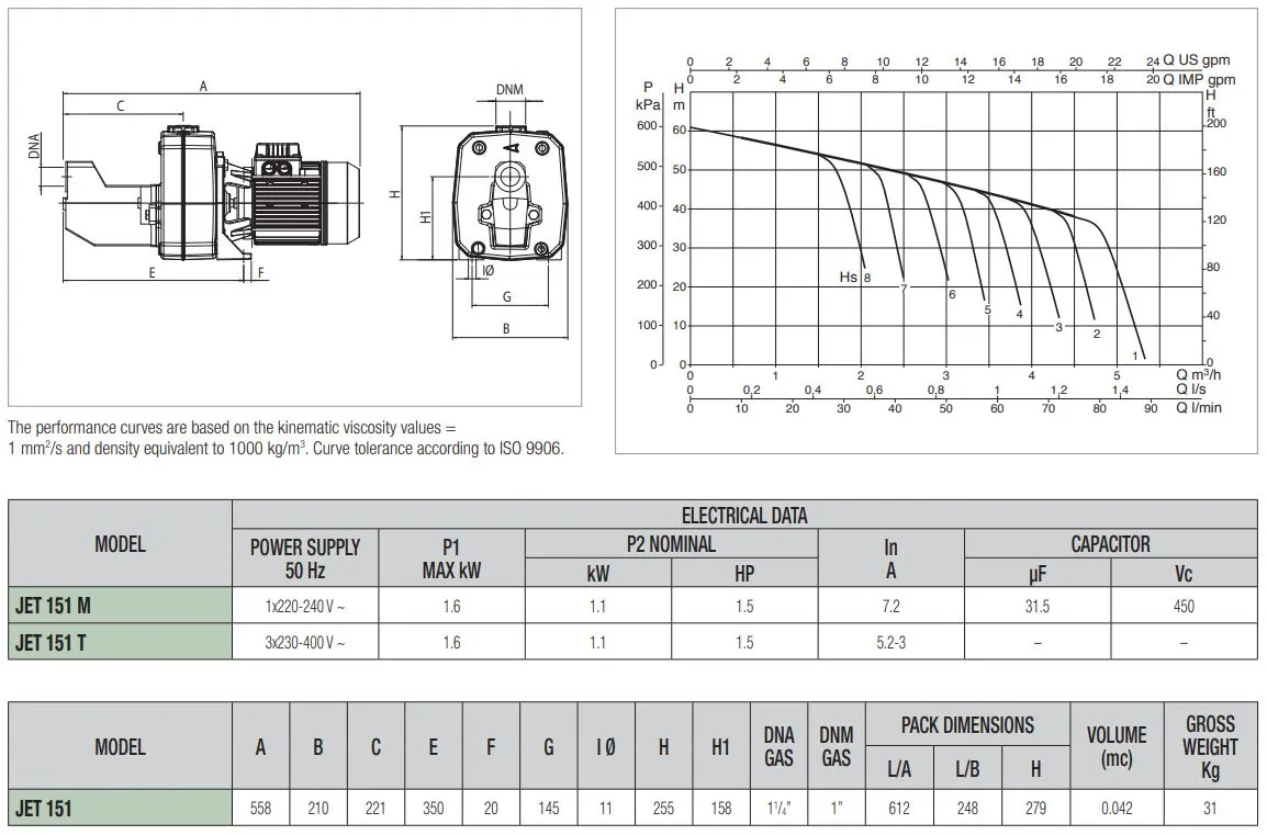De DAB Jet 151 T is geschikt voor continu gebruik en kan tot 8 meter diep het water aanzuigen. De pomp heeft een maximale pompcapaciteit van 4.200 liter per uur en een maximale opvoerhoogte van 61 meter (6,1 bar). De DAB Jet 151 T is een 400V pomp met een vermogen van 1,1 kW en wordt standaard geleverd zonder aansluitkabel/stroomkabel.