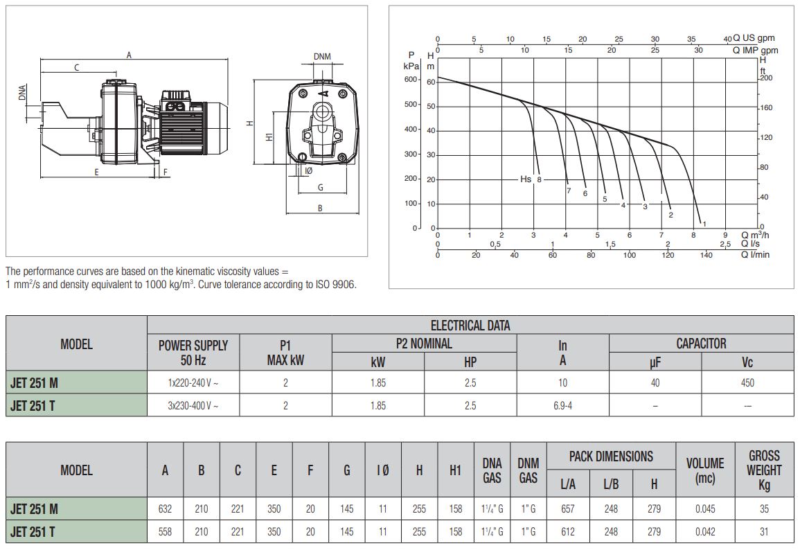 De DAB Jet 251 M is geschikt voor continu gebruik en kan tot 8 meter diep het water aanzuigen. De pomp heeft een maximale pompcapaciteit van 7.200 liter per uur en een maximale opvoerhoogte van 62 meter (6,2 bar). De DAB Jet 251 M is een 230V pomp met een vermogen van 1,85 kW en wordt standaard geleverd zonder aansluitkabel/stroomkabel.