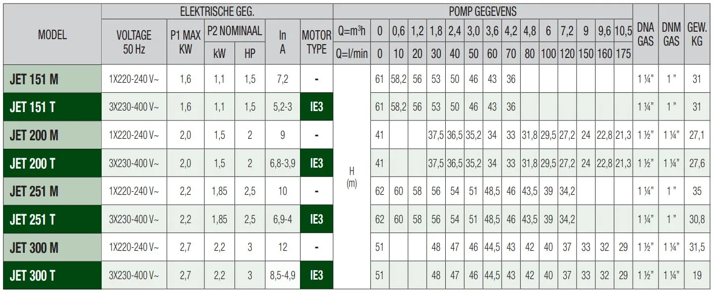 De DAB Jet 300 M is geschikt voor continu gebruik en kan tot 8 meter diep het water aanzuigen. De pomp heeft een maximale pompcapaciteit van 10.500 liter per uur en een maximale opvoerhoogte van 51 meter (5,1 bar). De DAB Jet 300 M is een 230V pomp met een vermogen van 2,2 kW en wordt standaard geleverd zonder aansluitkabel/stroomkabel.