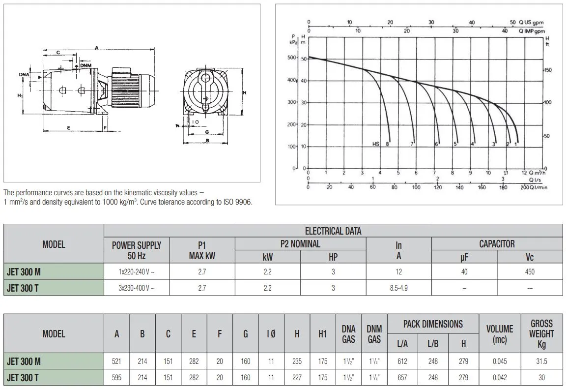 De DAB Jet 300 T is geschikt voor continu gebruik en kan tot 8 meter diep het water aanzuigen. De pomp heeft een maximale pompcapaciteit van 10.500 liter per uur en een maximale opvoerhoogte van 51 meter (5,1 bar). De DAB Jet 300 T is een 400V pomp met een vermogen van 2,2 kW en wordt standaard geleverd zonder aansluitkabel/stroomkabel.