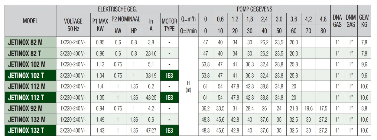 De DAB Jetinox 132 M is geschikt voor continu gebruik en kan tot 8 meter diep het water aanzuigen. De pomp heeft een maximale pompcapaciteit van 4.800 liter per uur en een maximale opvoerhoogte van 48 meter (4,8 bar). De DAB Jetinox 132 M is een 230V pomp met een vermogen van 1 kW en wordt standaard geleverd zonder aansluitkabel/stroomkabel.