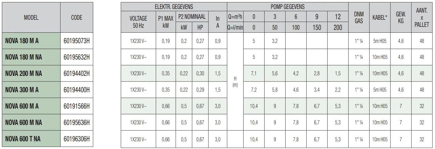 De DAB Nova 300 M-A is geschikt voor continu gebruik en heeft een ingebouwde thermische beveiliging. De pomp heeft een maximale pompcapaciteit van 13.000 liter per uur en een maximale opvoerhoogte van 6 meter (0,6 bar). De DAB Nova 300 M-A is een 230V pomp met een vermogen van 0,22 kW en wordt standaard geleverd met 5 meter stroomkabel.