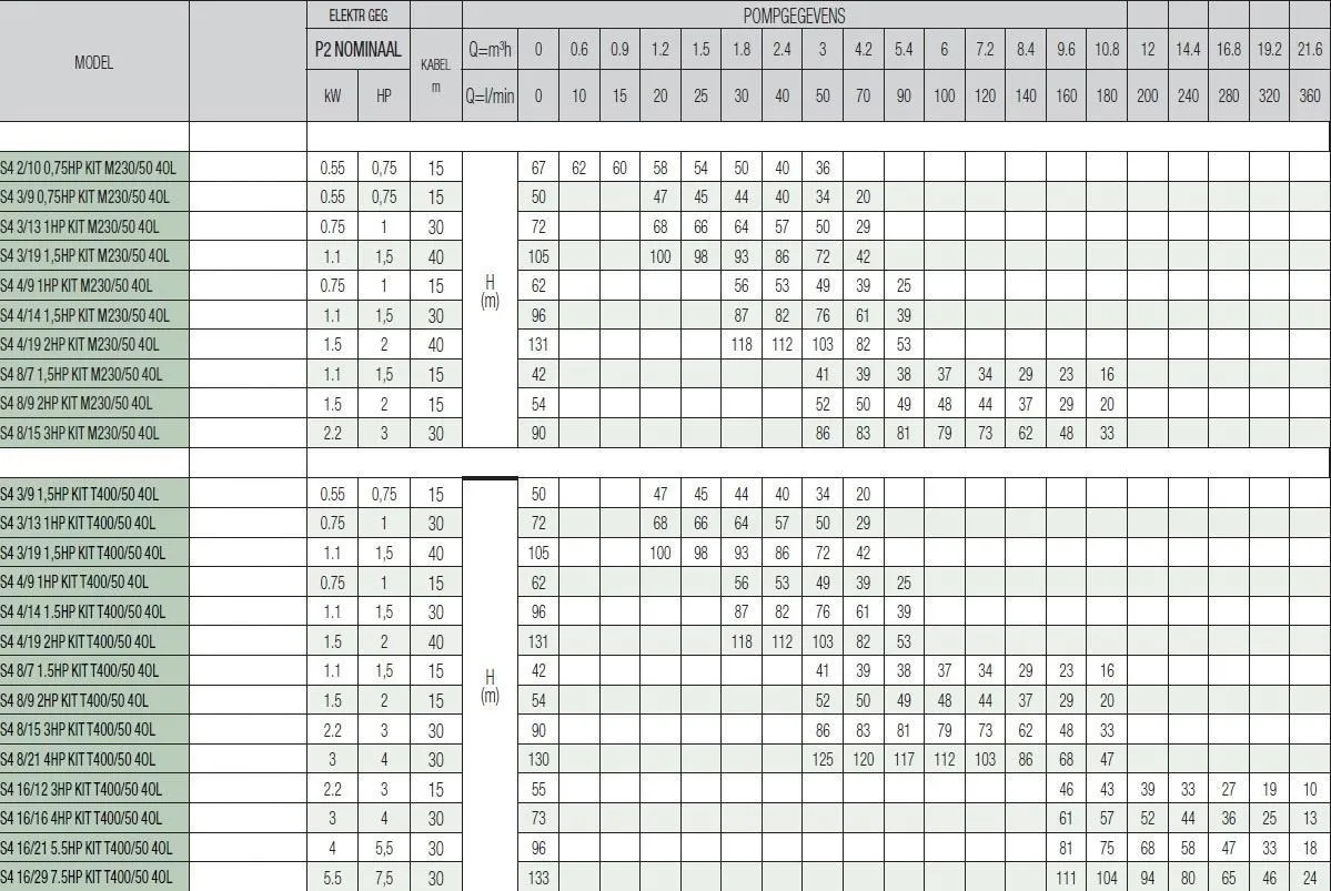 De Dab S4 16/16 4HP KIT T400/50 4OL volt bronpomp set is een gebruiksvriendelijke, compacte meertraps-centrifugale bronpomp voor putten van 4'' of groter met een breed scala aan wateropbrengsten en opvoerhoogtes. Deze bronpomp is de opvolger van de DAB F10T kit.