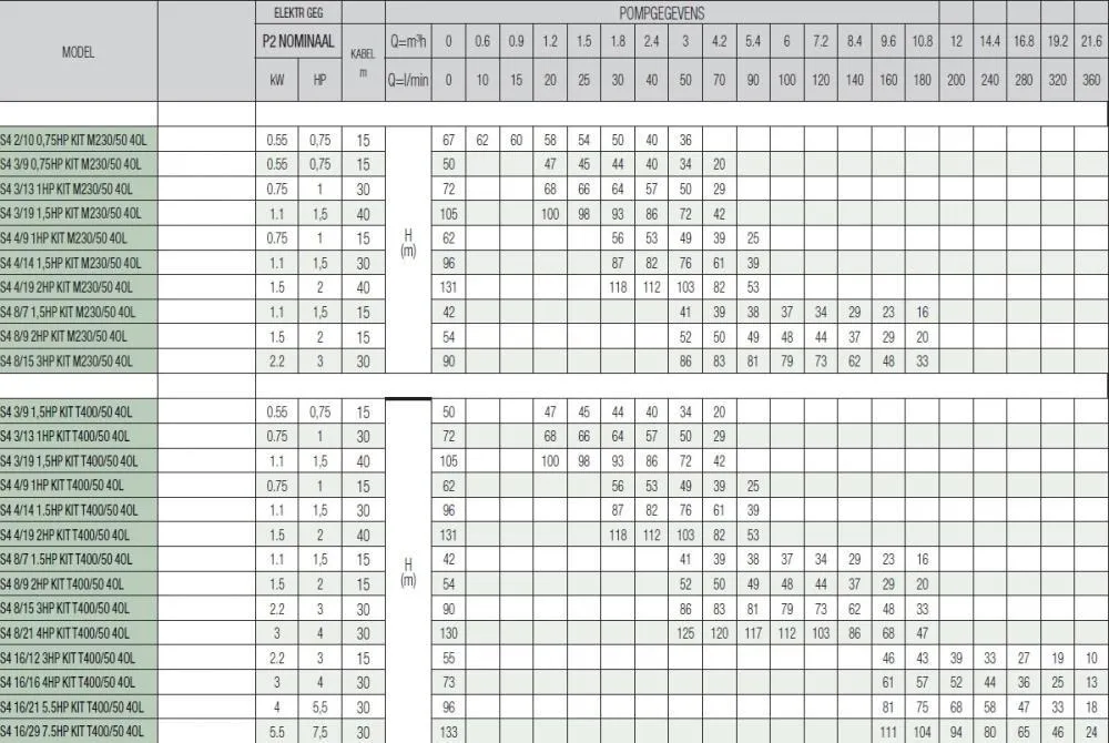 De Dab S4 3/9 0,75HP KIT T400/50 4OL bronpomp is een gebruiksvriendelijke, compacte meertraps-centrifugale bronpomp voor putten van 4 '' of groter met een breed scala aan wateropbrengsten en opvoerhoogtes. Deze bronpomp is de opvolger van de DAB S4C 9T kit.