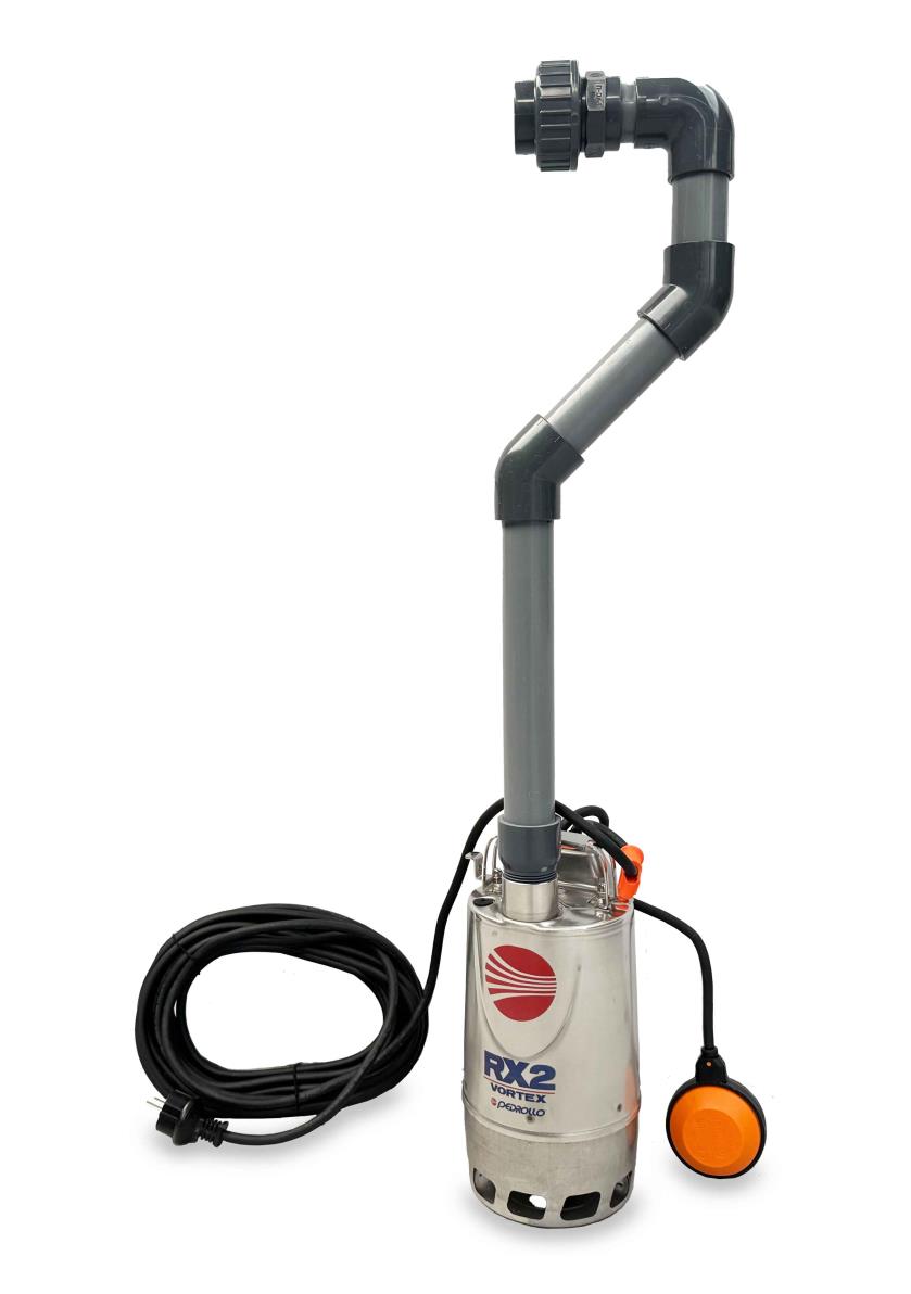 Het systeem is voorzien van een Pedrollo RXm Vortex 2/20 dompelpomp met vlotter. De pomp heeft een maximale doorlaat van 20 mm en is hierdoor uitstekend geschikt voor het verpompen van grotere vaste delen of ijzerhoudend water. Daarnaast is de dompelpomp volledig RVS uitgevoerd en beschikt over een pompcapaciteit van ruim 11 m3 per uur.