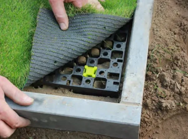 De Drainbase-plaat buffert 30-liter water per m². De oplossing voor een perfect waterdoorlatende, groene en ecologisch verantwoorde verharding. De gepatenteerde verbindingen zorgen ervoor dat de platen kunnen krimpen en uitzetten binnen hun eigen afmetingen, dit zowel tijdens plaatsing bij koude als bij warme temperaturen. De plaat is aan de bovenzijde voorzien van 1010 anti-slip pinnetjes van 2mm hoogte die ervoor zorgen dat het kunstgras mooi op z'n plaats blijft zonder schade te berokkenen aan de backing van het kunstgras.