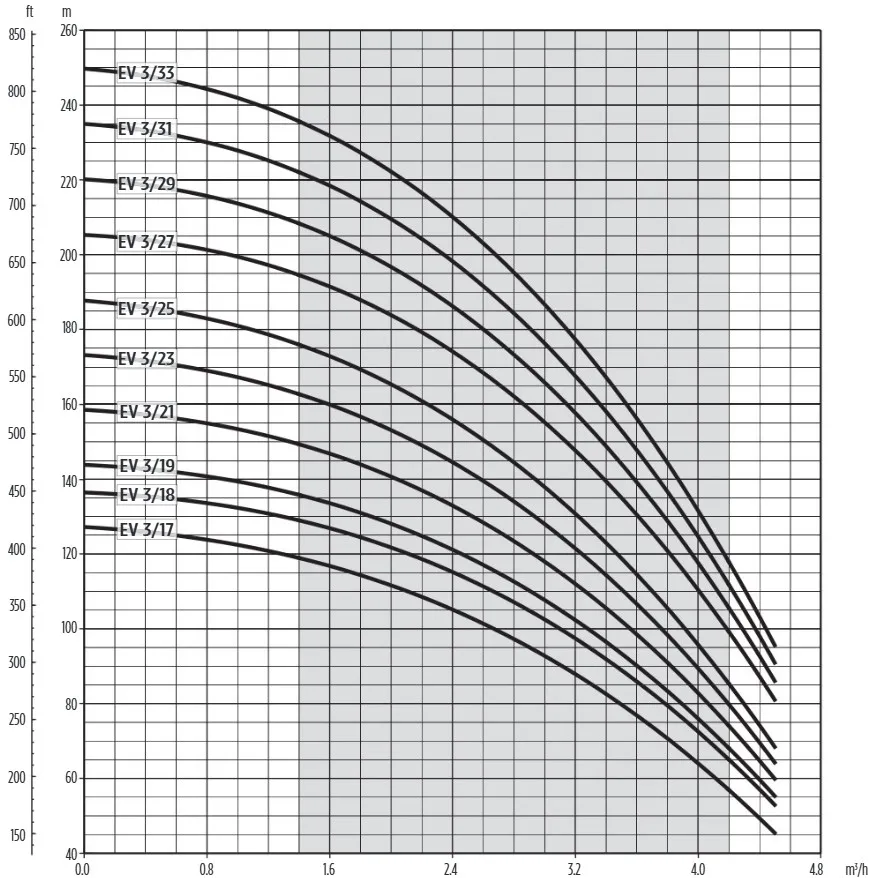 De Franklin EV 3/17 is niet-zelfaanzuigend en dient te worden gemonteerd met een terugslagklep. De pomp heeft een maximale pompcapaciteit van 4.200 liter per uur en een maximale opvoerhoogte van 118 meter (11,8 bar). De Franklin EH 3/17 is een 400V pomp met een vermogen van 1,5 kW en wordt standaard geleverd zonder aansluitkabel/stroomkabel.