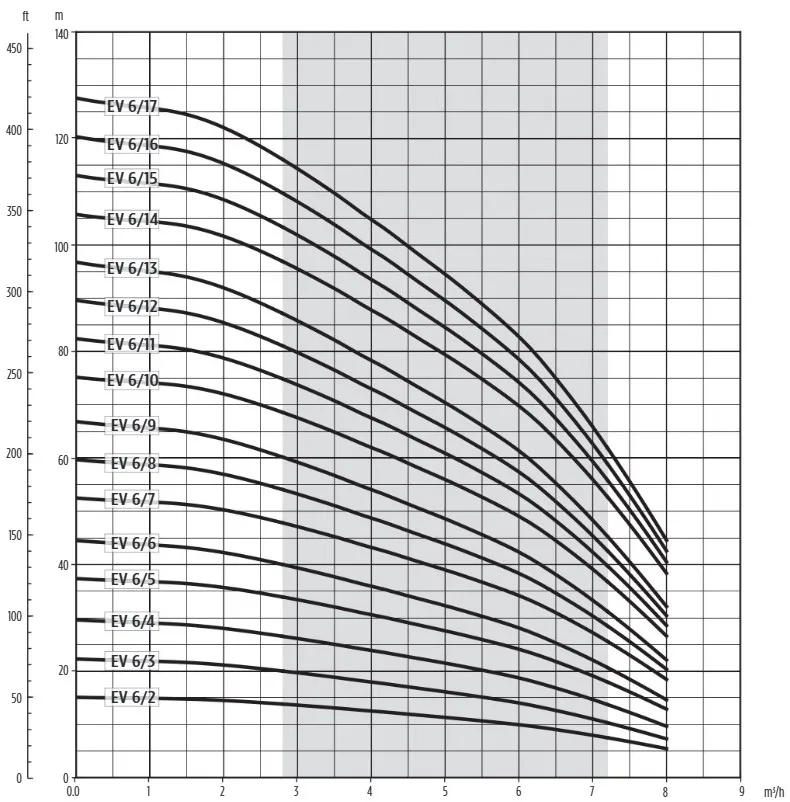 De Franklin EV 6/30 is niet-zelfaanzuigend en dient te worden gemonteerd met een terugslagklep. De pomp heeft een maximale pompcapaciteit van 7.200 liter per uur en een maximale opvoerhoogte van 210 meter (21,0 bar). De Franklin EH 6/30 is een 400V pomp met een vermogen van 4 kW en wordt standaard geleverd zonder aansluitkabel/stroomkabel.