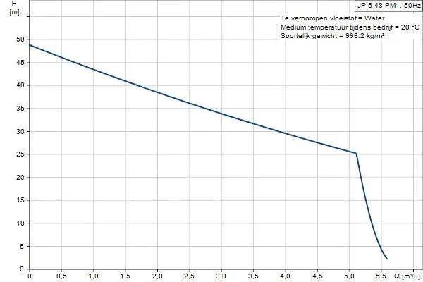 De Grundfos JP 5-48 PM1 heeft een ingebouwde thermische beveiliging en kan tot 8 meter diep het water aanzuigen. De pomp heeft een maximale pompcapaciteit van 5.000 liter per uur en een maximale opvoerhoogte van 48 meter (4,8 bar). De Grundfos JP 5-48 PM1 is een 230V pomp met een vermogen van 1 kW en wordt standaard geleverd met aansluitkabel/stroomkabel.