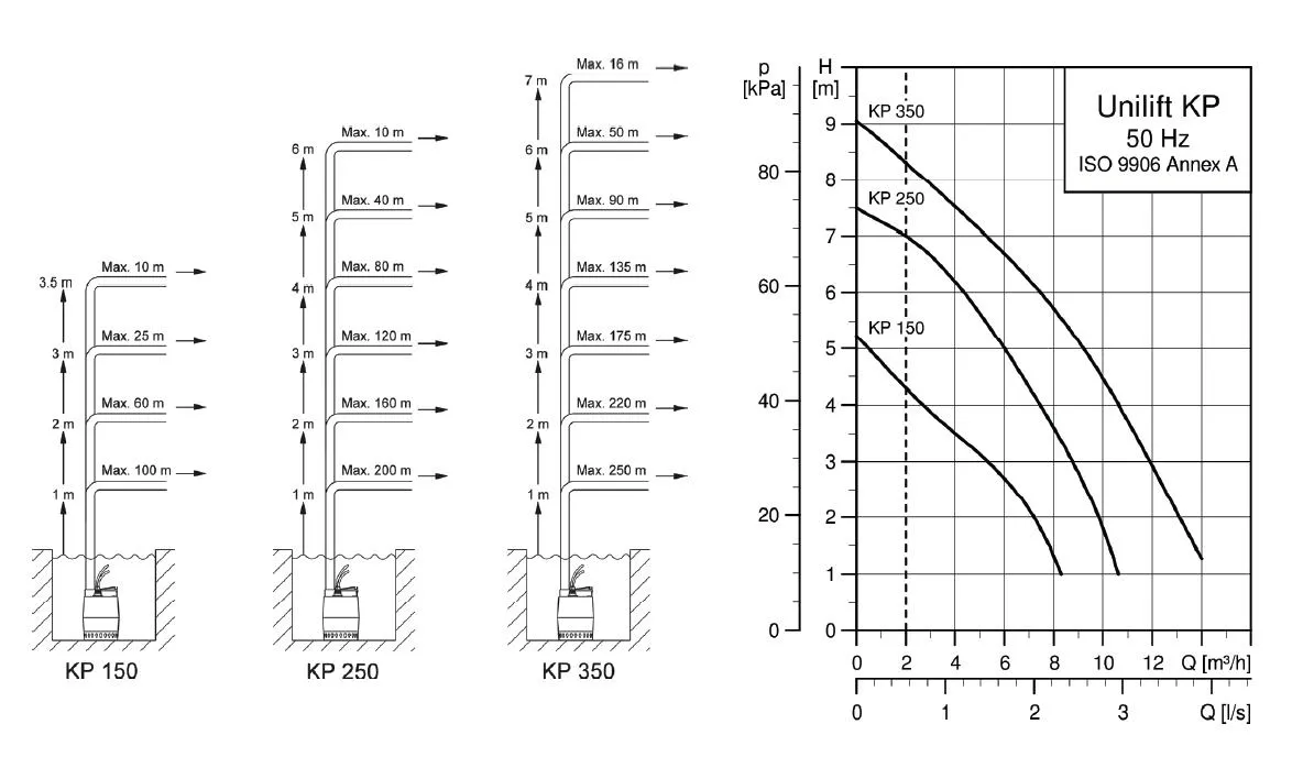 De Grundfos Unilift KP250 AV1 beschikt over een koelmantel en heeft een ingebouwde thermische beveiliging. De pomp heeft een maximale pompcapaciteit van 11.000 liter per uur en een maximale opvoerhoogte van 7 meter (0,7 bar). De Grundfos Unilift KP250 AV1 is een 230V pomp met een vermogen van 0,5 kW en wordt standaard geleverd met 5 meter stroomkabel.