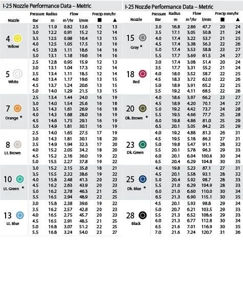 Nozzleset voor de Hunter I-25 pop-up sproeier. Deze set bestaat uit 5 nozzles. In de tabel is aangegeven welke afstand iedere nozzle doet.