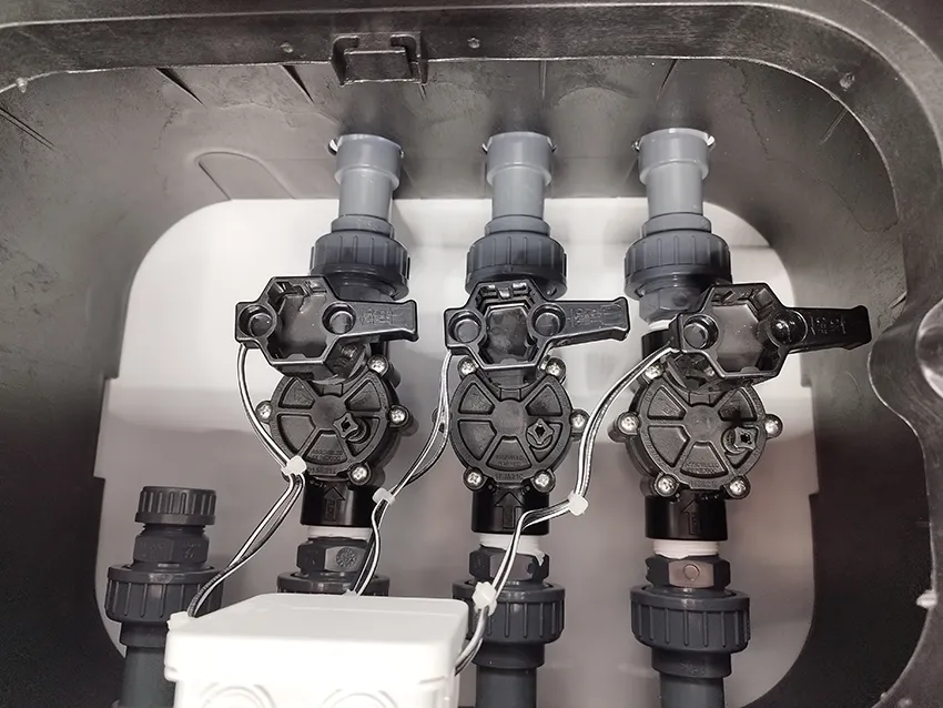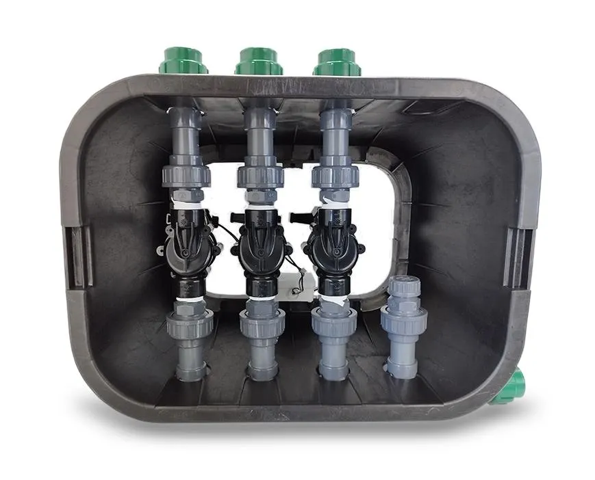 De kleppendoos compleet 3 zones is een voor geproduceerde kleppendoos met 3 Rainbird DV magneetkleppen en 1 vrije ingang. De vrije ingang is te gebruiken voor een extra zone of als doorspuitvoorziening. De kleppendoos beschikt over 32 mm tyleen aansluiting. Dankzij de afneembare deksel heb je eenvoudig toegang tot de magneetkleppen.