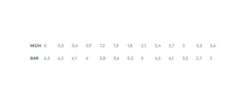 | M3/H | 0 | 0,3 | 0,6 | 0,9 | 1,2 | 1,5 | 1,8 | 2,1 | 2,4 | 2,7 | 3 | 3,3 | 3,6 |