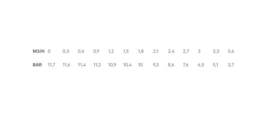 | M3/H | 0 | 0,3 | 0,6 | 0,9 | 1,2 | 1,5 | 1,8 | 2,1 | 2,4 | 2,7 | 3 | 3,3 | 3,6 |