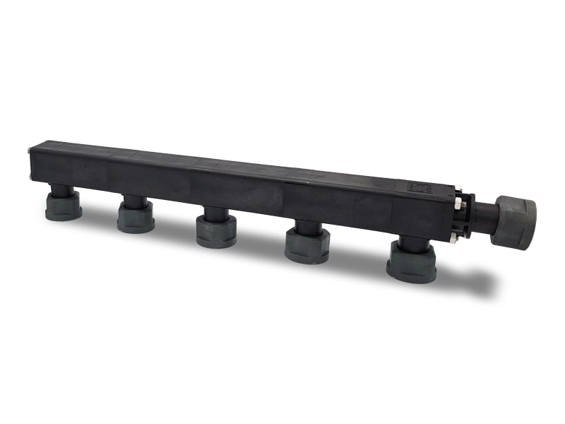 Compacte 5-weg manifoldvoor het eenvoudig opdelen van uw beregeningsgebied in verschillende sectoren. Alle met 1" swivelende moer.Hartafstand tussen de leidingen is 9,3 centimeter.