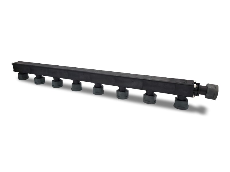 Compacte 8-weg manifoldvoor het eenvoudig opdelen van uw beregeningsgebied in verschillende sectoren. Alle met 1" swivelende moer.Hartafstand tussen de leidingen is 9,3 centimeter.