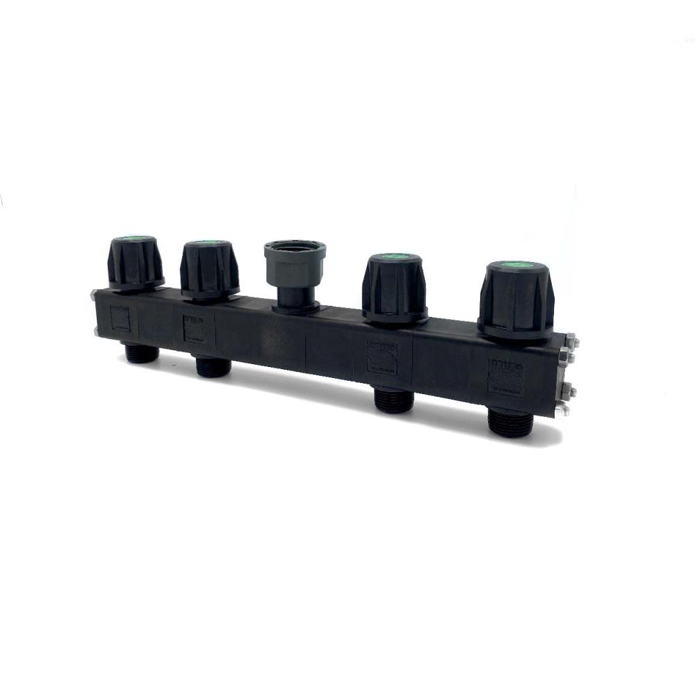 Een manifold verdeler met kraan is ideaal voor het verdelen van uw beregeningsinstallatie in meerdere zones. Magneetkleppen kunnen direct op de verdeler gemonteerd worden. Ook is het mogelijk om een waterslang verbinding te maken. De verdeler beschikt over een wartel 1" bovenzijde en een 3/4" buitendraad aan de onderzijde. Dankzij de kranen is het mogelijk om handmatig de waterhoeveelheid te regelen.