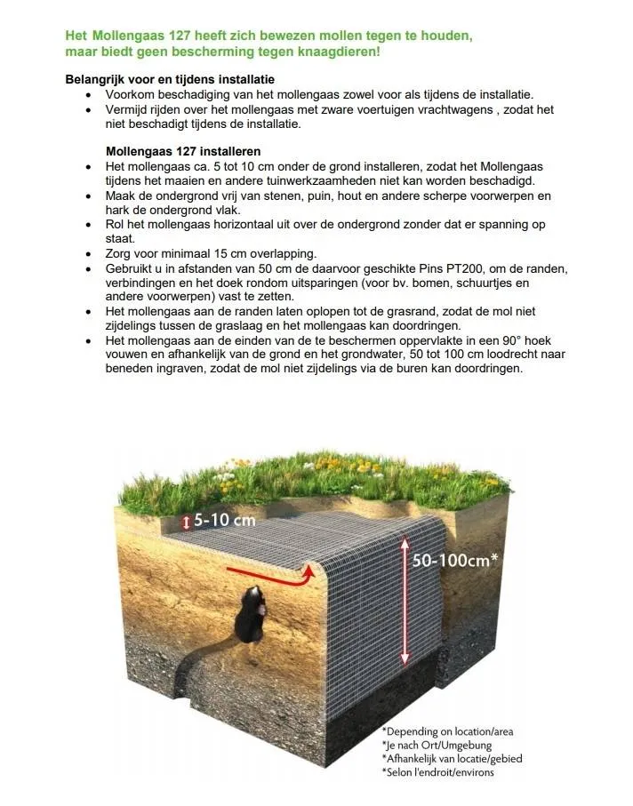 niet beschadigt tijdens de installatie. - Het mollengaas ca. 5 tot 10 cm onder de grond installeren, zodat het Mollengaas