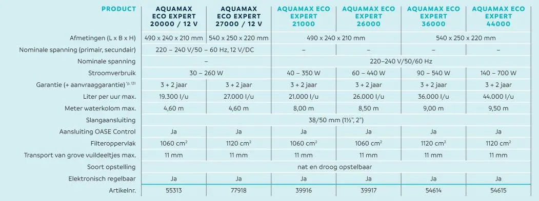 De Oase AquaMax Eco Expert 36000 vijverpomp is een echte krachtpatser met een laag energieverbruik. In combinatie met de robuuste behuizing is deze vijverpomp perfect voor veeleisende filterinstallaties of voor grote beeklopen en watervallen. Vuildeeltjes tot 11 mm worden probleemloos doorgevoerd.