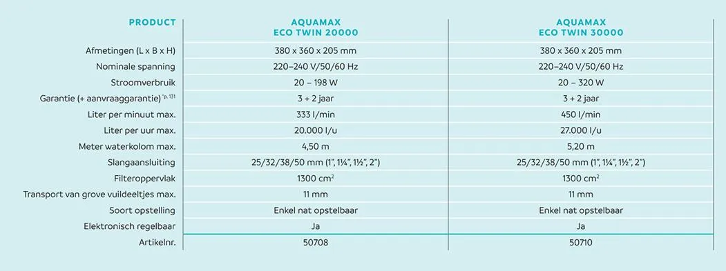 De AquaMax Eco Twin 30000 heeft een grote en betrouwbare transportcapaciteit van 30000 Liter/uur en een maximale opvoerhoogte van 5,2 meter. De energie-efficiënte filterpomp zorgt voor een zuinig energieverbruik.