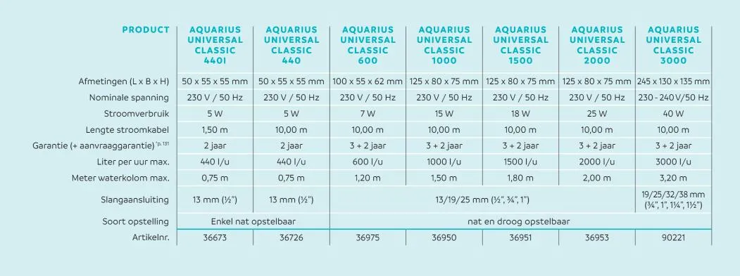 De Oase Aquarius Universal Classic 1500 (voorheen Neptun 1500) heeft een groot vermogen en is erg compact. Ook in ondiep water wordt er optimaal aangezogen. Daarnaast is de fonteinpomp bijzonder geluidsarm en is hierdoor ideaal voor binnen gebruik.