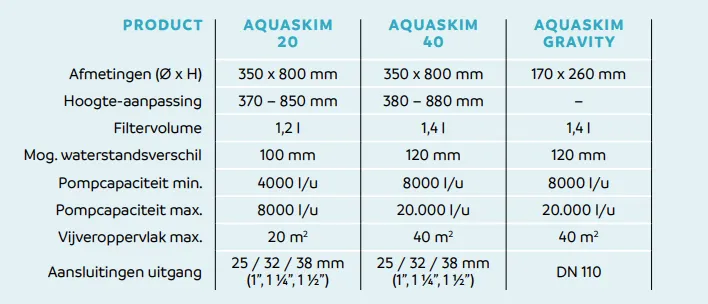 Gemakkelijk te onderhouden dankzij de toegankelijke korf voor grove vuildeeltjes. Daarnaast past de skimmer zich aan tot waterstandsveranderingen tot 120 mm.