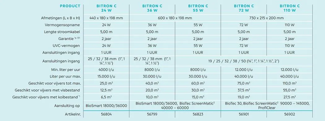 De Oase Bitron C 75W is speciaal ontwikkeld voor de vijverliefhebber die net even iets meer verwacht van zijn totale filterinstallatie. Voornamelijk in de grotere en/of professionele filterinstallaties wordt dit model vaak gebruikt. De grootste voordelen zitten in de totale reiniging van het vijverwater. Dankzij een gepatenteerde automatische reiniging van de lamp, de toegepaste bypass techniek en de individuele doorstroomregelaar bent u ten alle tijden verzekerd van een optimale waterbehandeling.