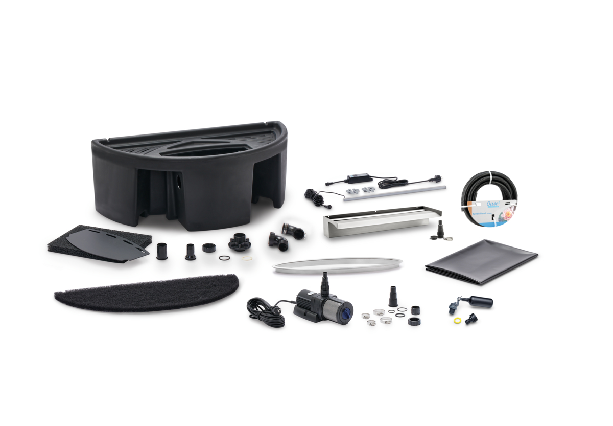 De Oase Waterfall 60 wall | Complete set wordt geleverd met pomp, vijverfolie, reservoir, waterval, verlichting, Silent Splash en aansluitmateriaal. Alles is perfect op elkaar afgestemd en garandeert een perfect waterval opstelling in de tuin.