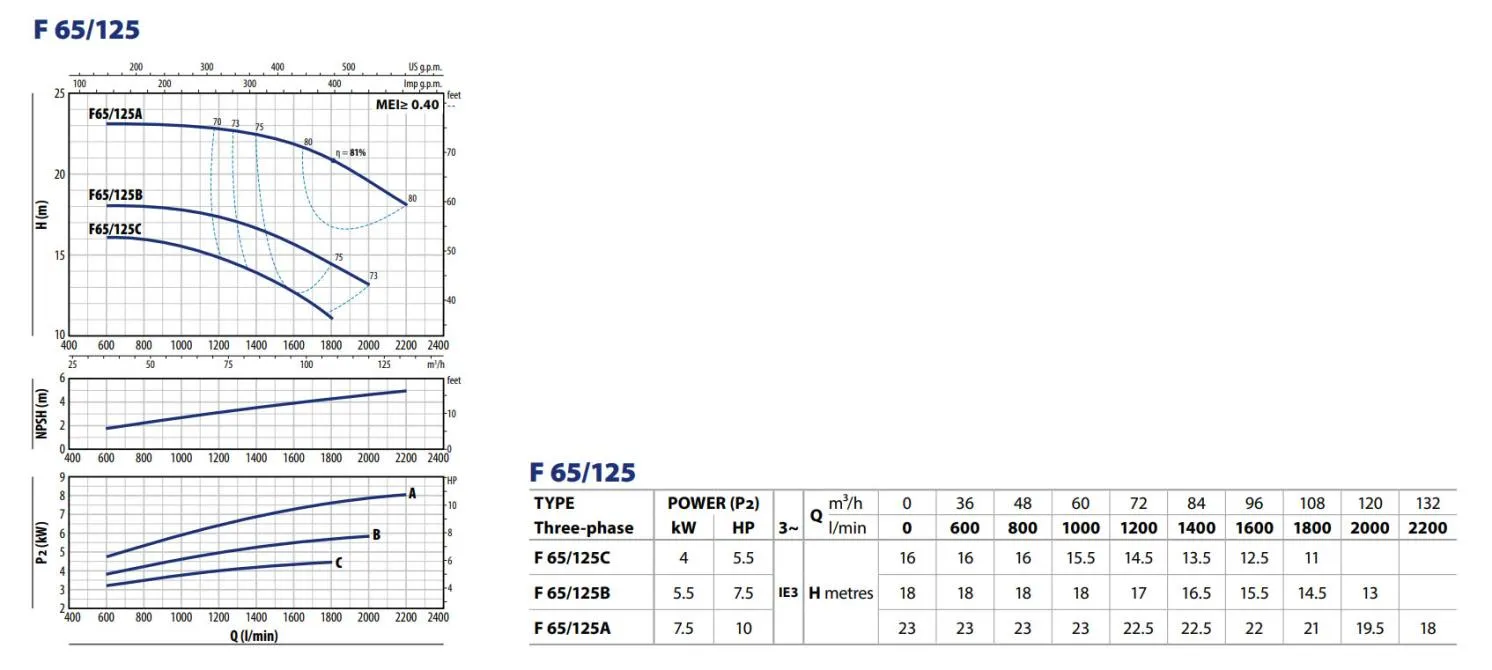 De Pedrollo F65/125A is niet-zelfaanzuigend en dient te worden gemonteerd met een terugslagklep. De pomp heeft een maximale pompcapaciteit van 132.000 liter per uur en een maximale opvoerhoogte van 23 meter (2,3 bar). De Pedrollo F65/125A is een 400V pomp met een vermogen van 7,5 kW en wordt standaard geleverd zonder aansluitkabel/stroomkabel.
