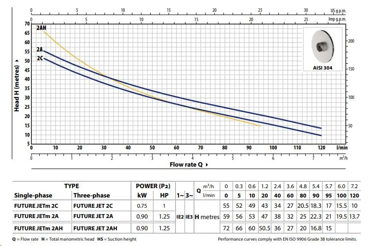 De Pedrollo Future JET 2C is met een aanzuigdiepte van 9 meter zeer geschikt om op grote diepte water aan te zuigen. De pomp heeft een maximale pompcapaciteit van 7.200 liter per uur en een maximale opvoerhoogte van 55 meter (5,5 bar). De Pedrollo Future JET 2C is een 400V pomp met een vermogen van 0,75 kW en wordt standaard geleverd zonder aansluitkabel/stroomkabel.