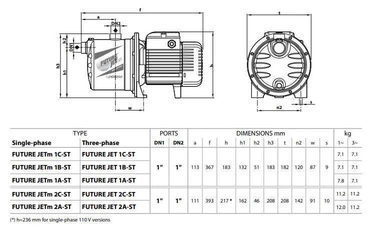 De Pedrollo Future JET 2C-ST is met een aanzuigdiepte van 9 meter zeer geschikt om op grote diepte water aan te zuigen. De pomp heeft een maximale pompcapaciteit van 7.200 liter per uur en een maximale opvoerhoogte van 55 meter (5,5 bar). De Pedrollo Future JET 2C-ST is een 400V pomp met een vermogen van 0,75 kW en wordt standaard geleverd zonder aansluitkabel/stroomkabel.