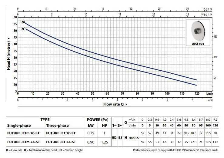 De Pedrollo Future JETm 2A-ST is met een aanzuigdiepte van 9 meter zeer geschikt om op grote diepte water aan te zuigen. De pomp heeft een maximale pompcapaciteit van 7.200 liter per uur en een maximale opvoerhoogte van 59 meter (5,9 bar). De Pedrollo Future JETm 2A-ST is een 230V pomp met een vermogen van 0,90 kW en wordt standaard geleverd zonder aansluitkabel/stroomkabel.