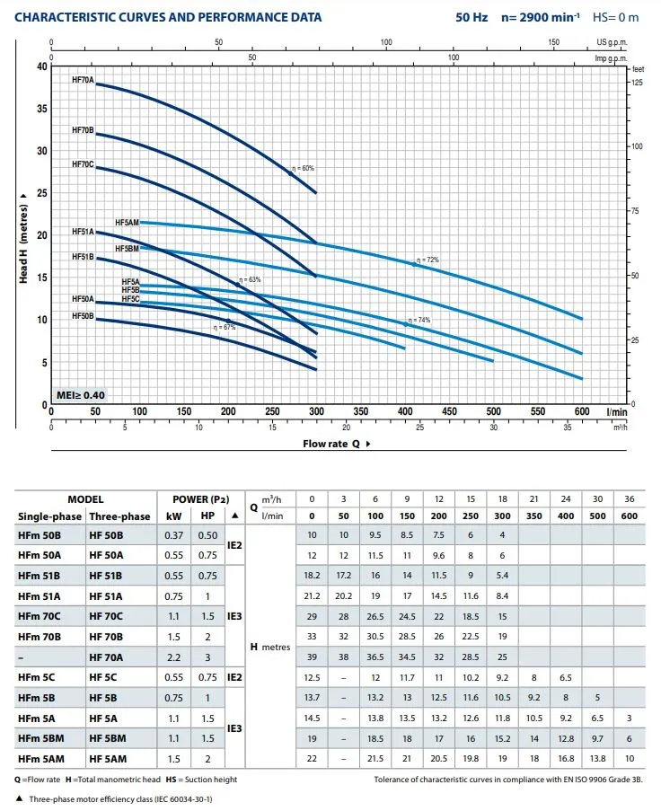 De Pedrollo HF/50A is niet-zelfaanzuigend en dient te worden gemonteerd met een terugslagklep. De pomp heeft een maximale pompcapaciteit van 18.000 liter per uur en een maximale opvoerhoogte van 12 meter (1,2 bar). De Pedrollo HF/50A is een 400V pomp met een vermogen van 0,55 kW en wordt standaard geleverd zonder aansluitkabel/stroomkabel.