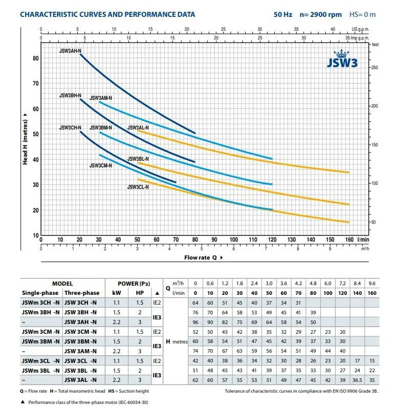 De Pedrollo JSWm/3BM is met een aanzuigdiepte van 9 meter zeer geschikt om op grote diepte water aan te zuigen. De pomp heeft een maximale pompcapaciteit van 7.200 liter per uur en een maximale opvoerhoogte van 56 meter (5,6 bar). De Pedrollo JSWm/3BM is een 230V pomp met een vermogen van 1,5 kW en wordt standaard geleverd zonder aansluitkabel/stroomkabel.