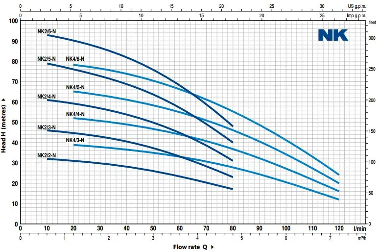 Pedrollo NK 2/5-N bronpomp is geschikt voor drinkwater installaties. Deze bronpomp heeft een capaciteit van 10 - 80 liter/min met een opvoerhoogte van 79 - 40 MwK. Maximaal verpompt de pomp 50 gram zand per M³.