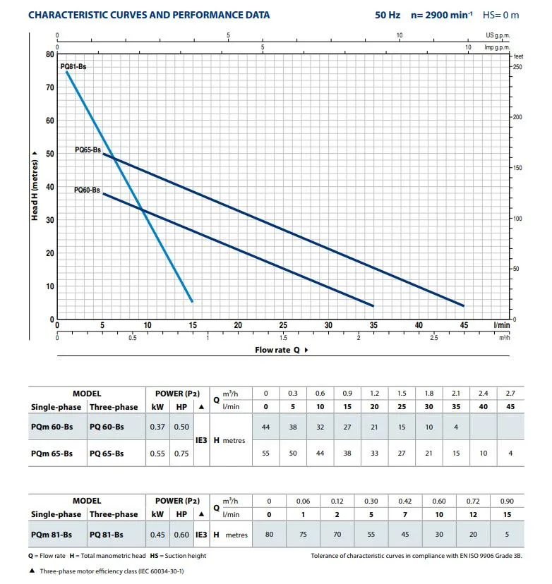 De Pedrollo PQm 60 BS (230V - 0,37 kW) is een kleine niet zelfaanzuigende centrifugaalpomp geschikt voor aanzuiging tot 8 meter. De pomp is voorzien van een messing waaier en RVS AISI 431 pomp as. Daarnaast is de BS versie tevens voorzien van een messing pomphuis.