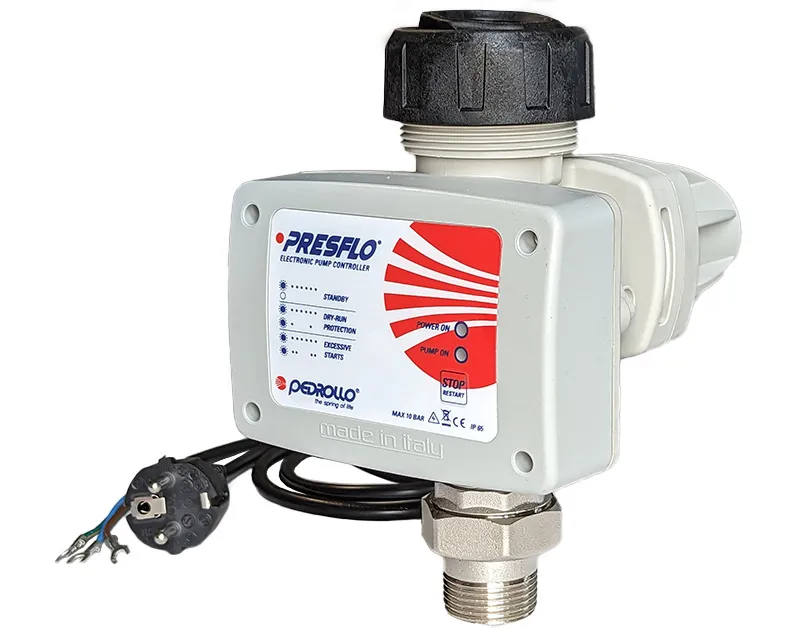 Presflo PF1215 - 2 PK / 1,5 kW | kabel & koppeling is een compacte doorstroom pompbesturing en geschikt voor alle pompinstallaties 230V tot 200 l/min. De Presflo laat de pomp automatisch in- en uitschakelen bij drukveranderingen. Geleverd met gemonteerde motorkabel (60 cm), netsnoer met stekker (150 cm) en 2e driedelige koppeling.