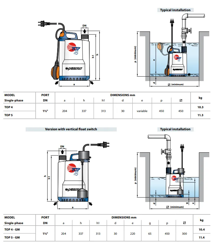 De Pedrollo Top 4N dompelpomp is een efficiënte dompelpomp, ontworpen voor het verpompen van schoon en licht vervuild afvalwater. De pomp heeft een maximale doorlaat van 10 mm, wat betekent dat de pomp in staat is om water met vaste delen tot 10 mm te verwerken.