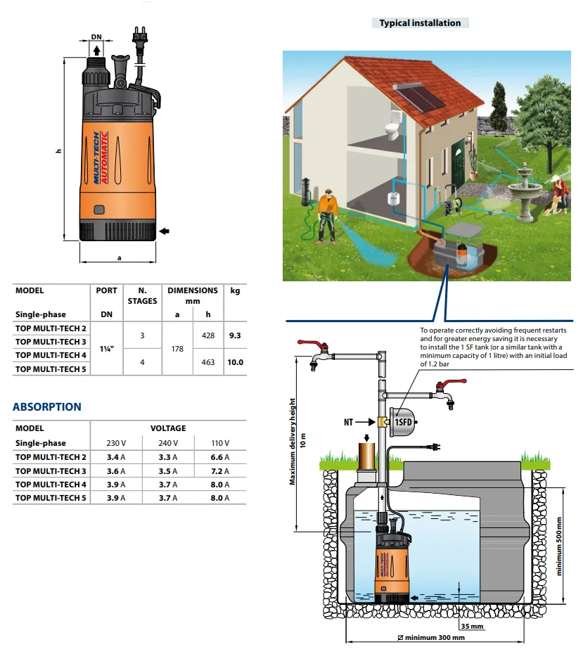 De Pedrollo Top Multi Tech 3 beschikt over een dubbele mantel en heeft een ingebouwde thermische beveiliging. De pomp heeft een maximale pompcapaciteit van 7.200 liter per uur en een maximale opvoerhoogte van 33 meter (3,3 bar). De Pedrollo Top Multi Tech 3 is een 230V pomp met een vermogen van 0,55 kW en wordt standaard geleverd met 10 meter stroomkabel.
