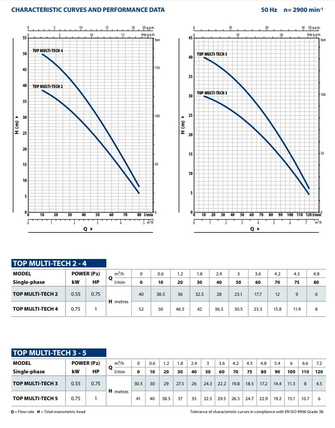 De Pedrollo Top Multi Tech 5 beschikt over een dubbele mantel en heeft een ingebouwde thermische beveiliging. De pomp heeft een maximale pompcapaciteit van 7.200 liter per uur en een maximale opvoerhoogte van 41 meter (4,1 bar). De Pedrollo Top Multi Tech 5 is een 230V pomp met een vermogen van 0,75 kW en wordt standaard geleverd met 10 meter stroomkabel.
