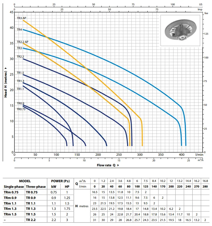 Een belangrijk kenmerk van de Pedrollo TR-serie is het gietijzeren pomphuis en motoromhulling in combinatie met de RVS pompas. Hiermee is de pomp solide, robuust en gegarandeerd van een lange levensduur.