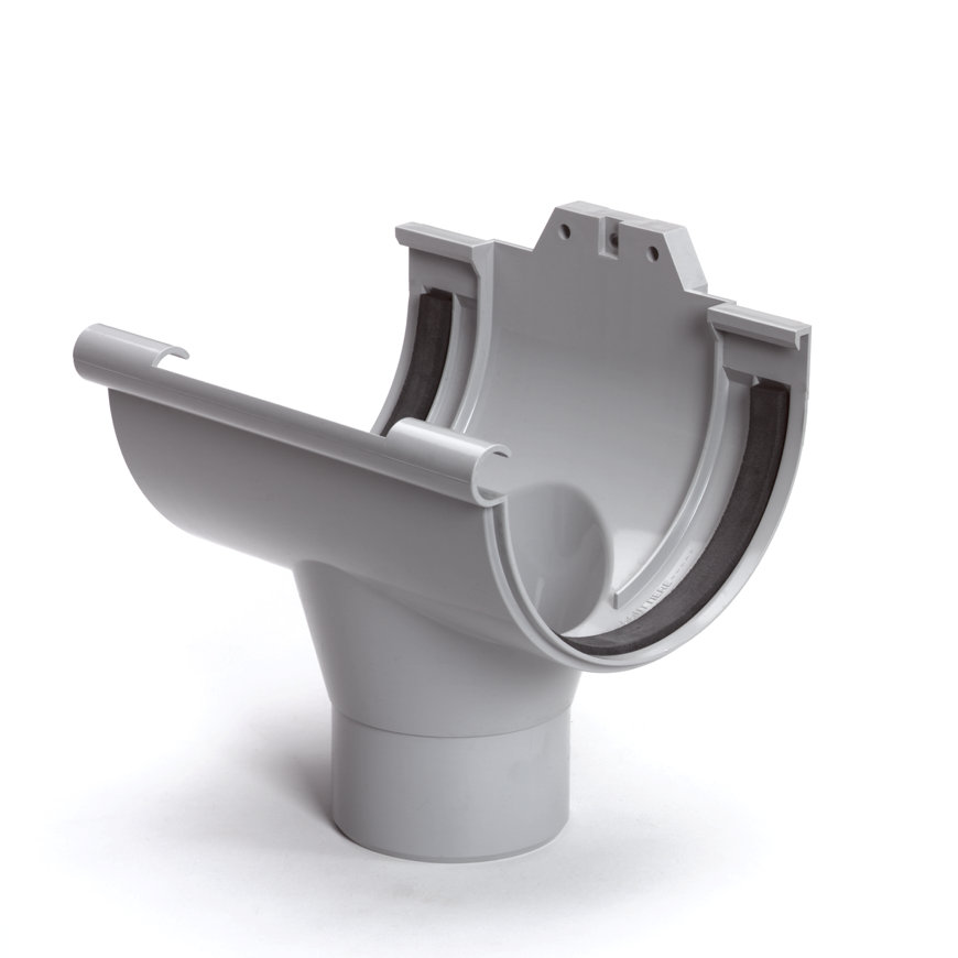 Gebruik de PVC mastgoot gootuitloop grijs voor het afvoeren van regenwater naar een 80 mm regenpijp. Deze sterke PVC uitloop is voorzien van schroefgaten voor wandmontage. Je bevestigd deze uitloop aan muren, palen of dakhaken. Plaats een HWA buis van 80 mm aan het uiteinde van de uitloop.